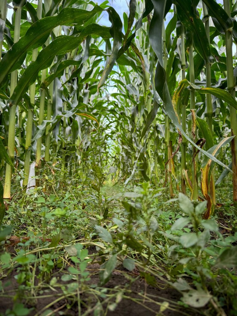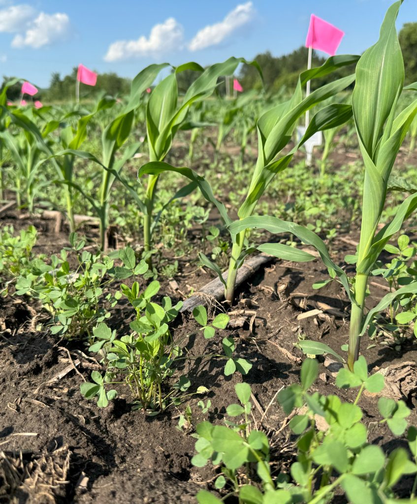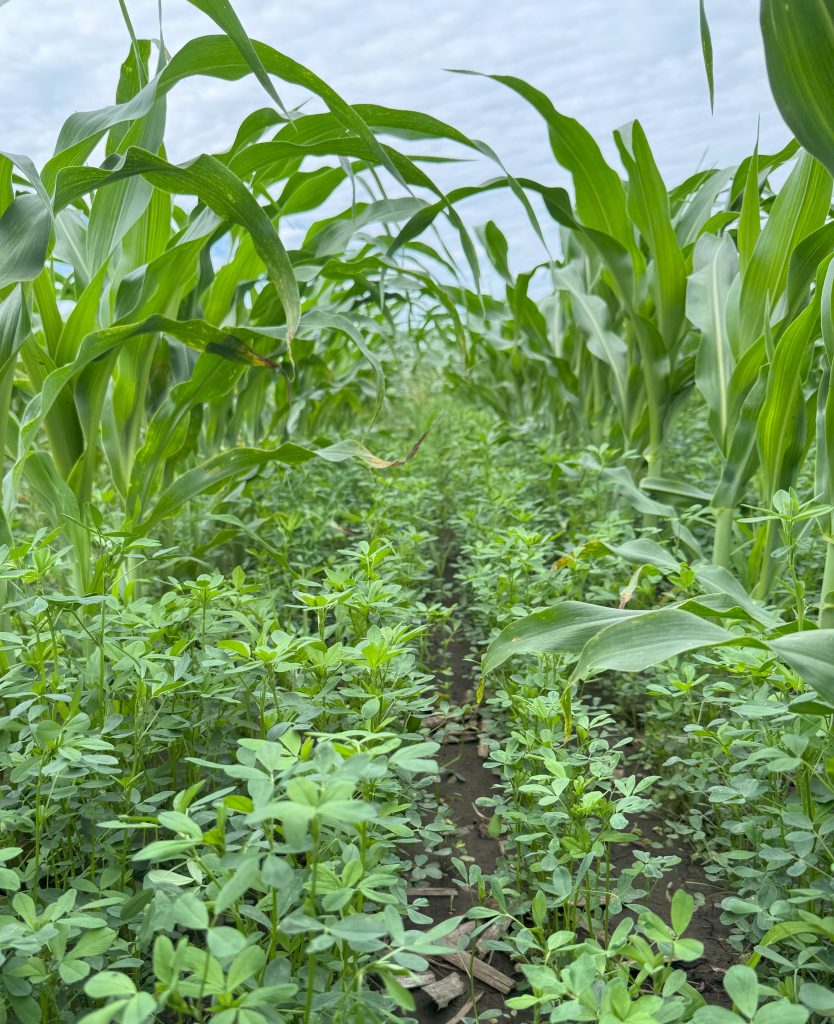 Figure 1. Corn–alfalfa interseeding three weeks after planting, showing the early establishment of both crops.