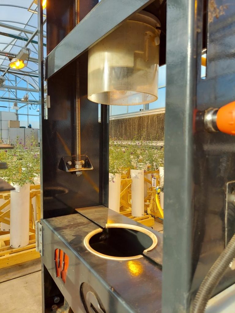 Figure 2. Greenhouse study simulating traffic stress to alfalfa plants. We are uniquely posed to run this trial thanks to Dr. Brian Luck’s expertise in developing a machine to simulate traffic.