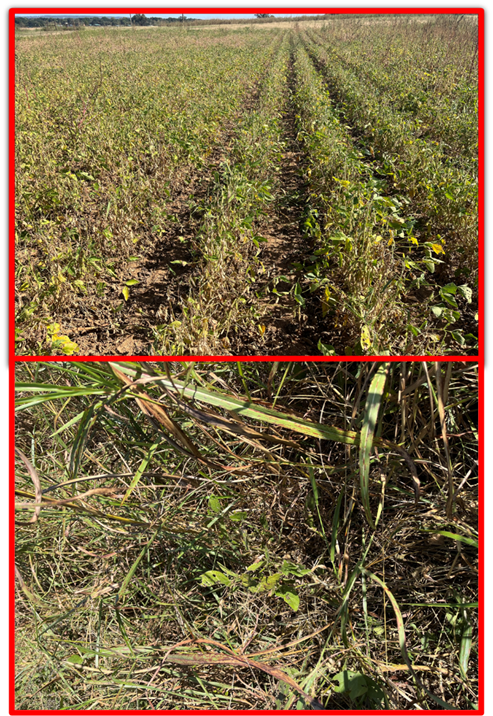 Figure 2. Soybean in the double-cropping system (tillage after harvest of the cash crop; top) and soybean in the no-till system (planted into the grazed cover crop’ bottom). Both pictures were taken in fall of 2024.